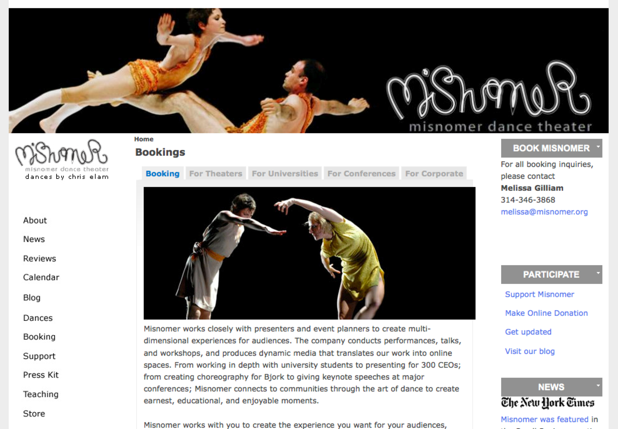 Misnomer has performed, done research, and created new work in Cuba, Brazil, Indonesia, Ireland, Holland, Ukraine, France, and Turkey, as well as throughout the United States. Based in New York City, the Company has performed locally at Dance Theater Workshop, the Skirball Center, Symphony Space, Danspace Project, PS 122, Joyce Soho, and at the River-to-River Festival.