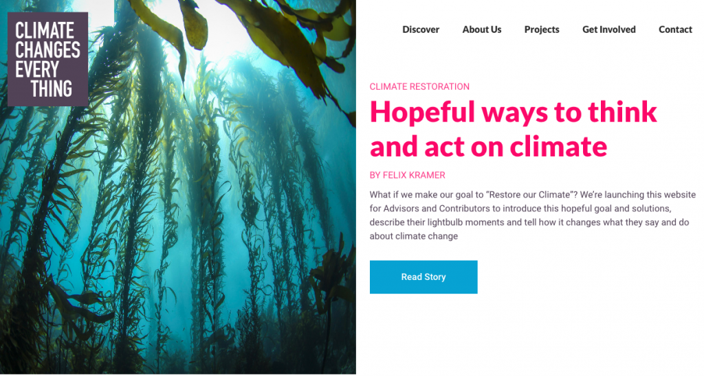 The owner of this site asks – What if we make our goal to “Restore our Climate”? This question prompted Felix Kramer to launch this site. It’s for Advisors & Contributors to introduce this hopeful goal, describe their lightbulb moments and tell the world how it changes what they say and do about climate change.