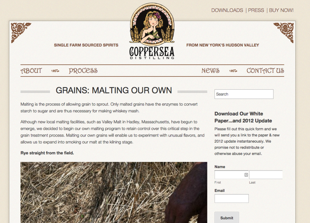 Coppersea Distilling is a Heritage Methods farm distillery in New York’s Hudson Valley. We provided strategy, design, development, and ongoing support for Coppersea’s launch. Within a few months of launch, Coppersea was featured in Time, Edible Manhattan, MSNBC, and several other media outlets.